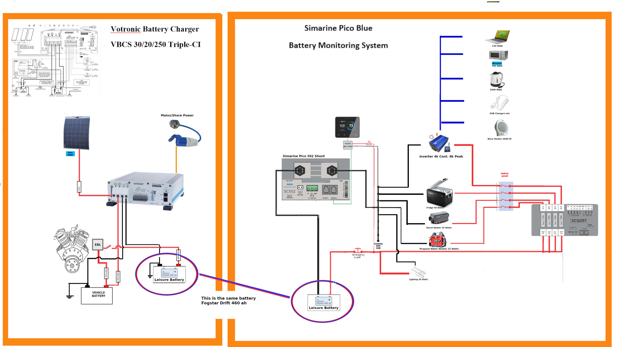 I have a Votronic triple charger VBCS 30/20/250 and a Pico Blue battery monitor - I can set these up separately as shown in the accompanying diagram however, I would like to combine both configurations onto the one battery - a Fogstar 460ah li-ion.