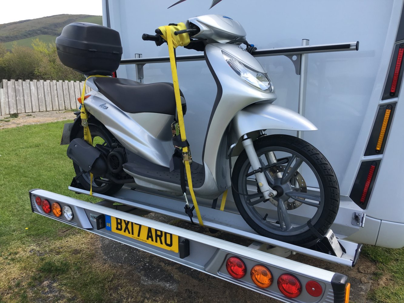 I trust the OP has done his homework carrying a 130kg+ scooter on the back of his Auto-Trail Dakota (assume no garage).