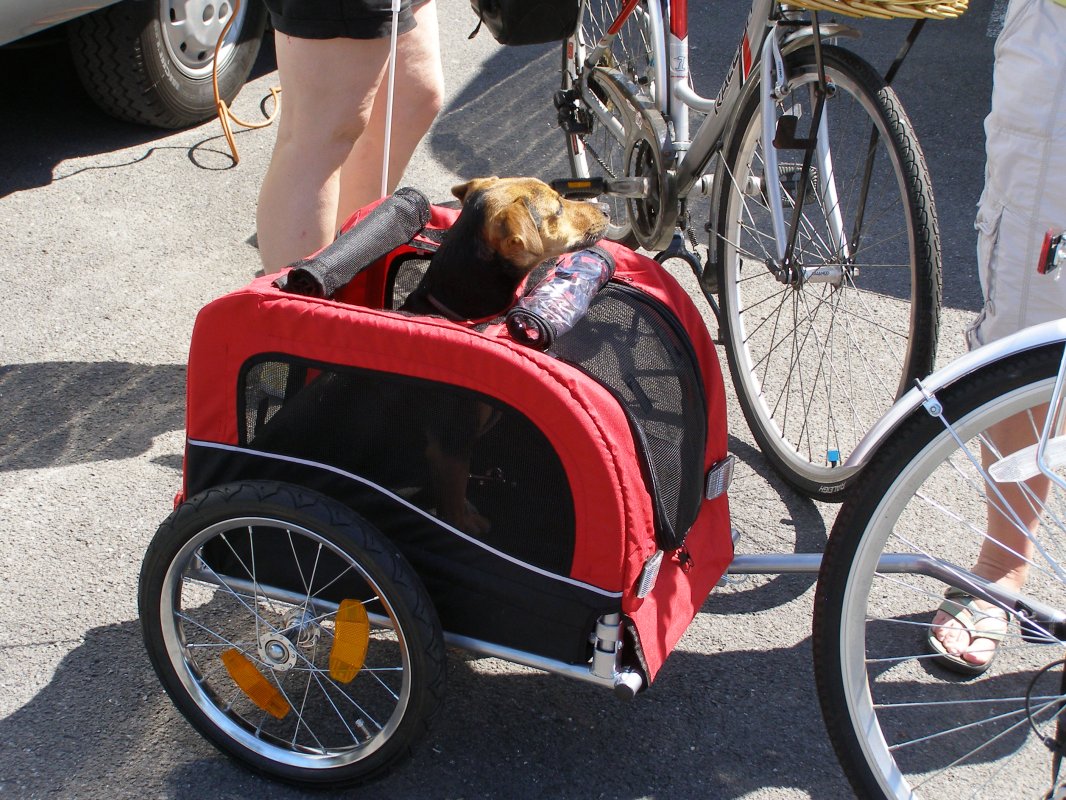 You can get a doggy trailer to fasten on back of your bike ,quite a few to choose from and not too expensive ,worth a look ,also 3 sizes .lol